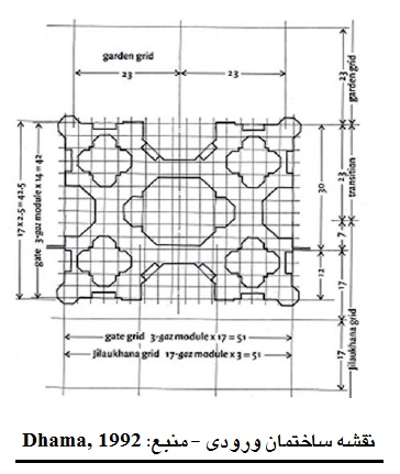در متن پادشاهنامه از طرح چهار ایوانی نام برده نشده است، اما به طرح عمارت دروازه به عنوان ساختمانی با چهار پیشطاق (ایوان) چنین اشاره شده است: “….در جهت شمالی و جنوبی این عمارت دو پیشطاق است هر یکی به طول شانزده گز و عرض نه و ارتفاع بیست و پنج – و در سمت شرقی و غربی دو پیشطاق است، هرکدام به طول دوازده گز و عرض هفت و ارتفاع نوزده” [۵]. افزون بر این میتوان طرح آرامگاه را که هشت بهشت است، نوعی چهار ایوانی برونگرا نیز به شمار آورد، زیرا چهار ایوان اصلی و بزرگ به چهار سمت قرار دارد.